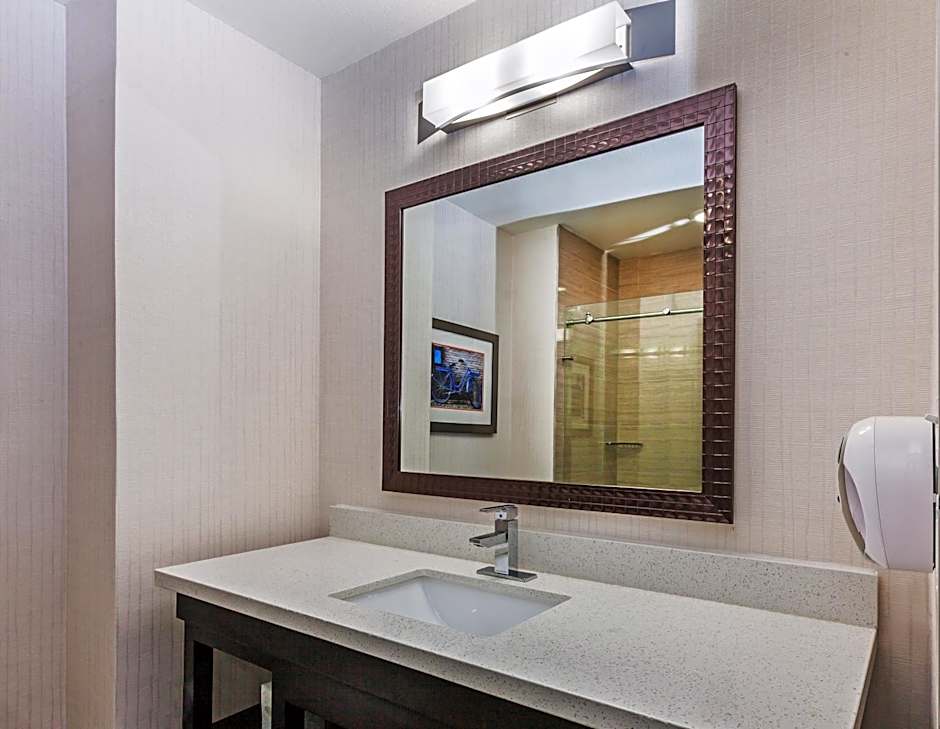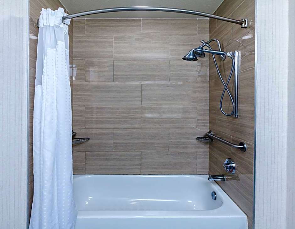 This suite features a living area with a flat-screen TV and a sofa bed. A microwave and refrigerator are provided.
